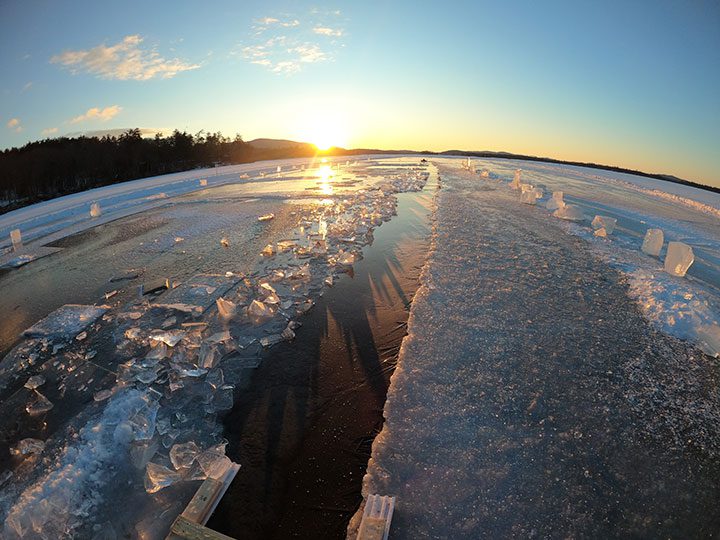 The RDC Ice Harvest took place from February 15 to 19 on Squaw Cove. The ice was 15 to 16 inches thick which makes the blocks around 160 pounds each! This year was very challenging with the warm winter weather. Thanks to everyone who worked with us this year! We are always looking for people to work the ice harvest, so please be in touch if you like hard work and could be available for four days next winter. Video by Eric Morse.